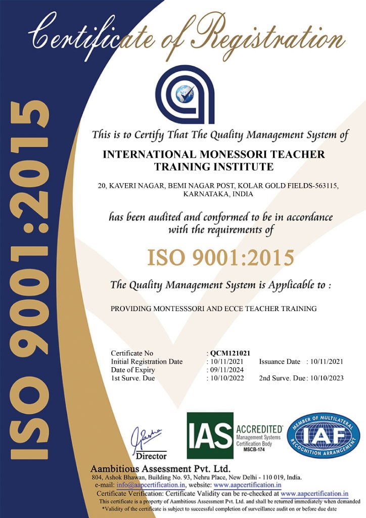 International Montessori Teacher Training Institute (IMTTI) and International Institute of Early Childhood Care and Education (IIECCE) are established to meet the growing demand for Early Childhood Educators in.India and abroad. Students from all states of India, Gulf Countries, North America, Europe, South Africa, Australia, Singapore, Indonesia and the far East participate in various programs offered by us. The diploma and certification programs of IMTTI & IIECCE equip the existing and aspiring educators to ensure the holistic development of children, at the preschool level (3 to 6 years of age) anywhere in the world.